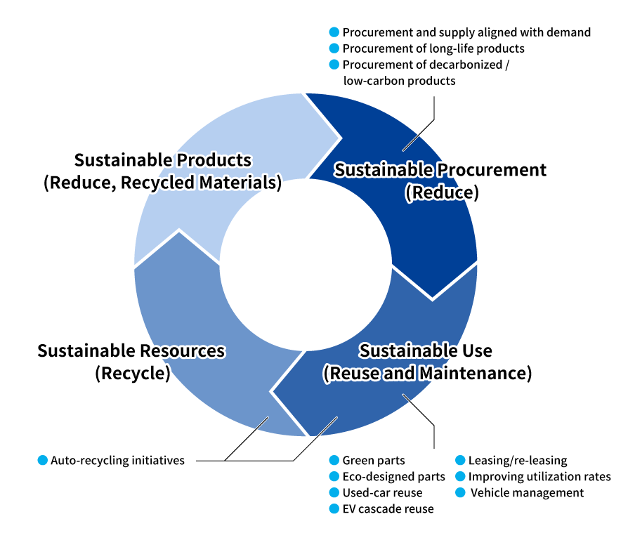 | Opportunities | When lease-end vehicles are not redeployed for a subsequent lease, SMAS sells them through used-vehicle channels such as auction houses. These activities contribute to circular resource use and extend the service life of vehicles. We also make effective use of resources by utilizing green parts in vehicle repair and related services. Given global resource depletion and population growth, demand for circular-economy initiatives is expected to increase further. We therefore anticipate that opportunities for SMAS's business to contribute in this area will continue to expand going forward. |