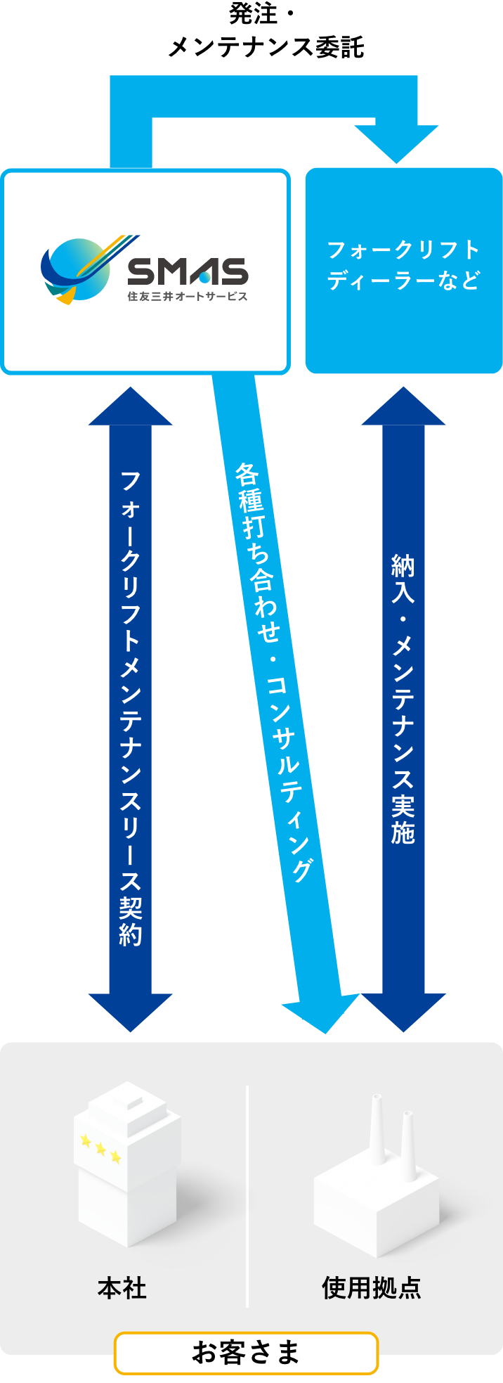 SMAS(住友三井オートサービス)はフォークリフトメンテナンスリースの豊富な実績とノウハウにより、お客さまのフォークリフト管理の最適化を実現します。