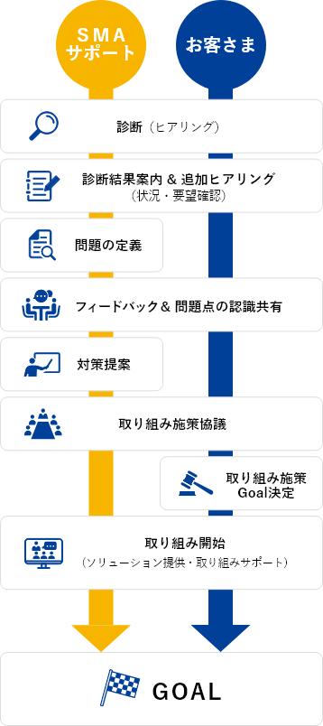 具体的には、お客さまの抱える問題を可視化し、その原因を特定した上で、最適な改善プランの提案により、目標達成に向けた活動の推進をサポートします。