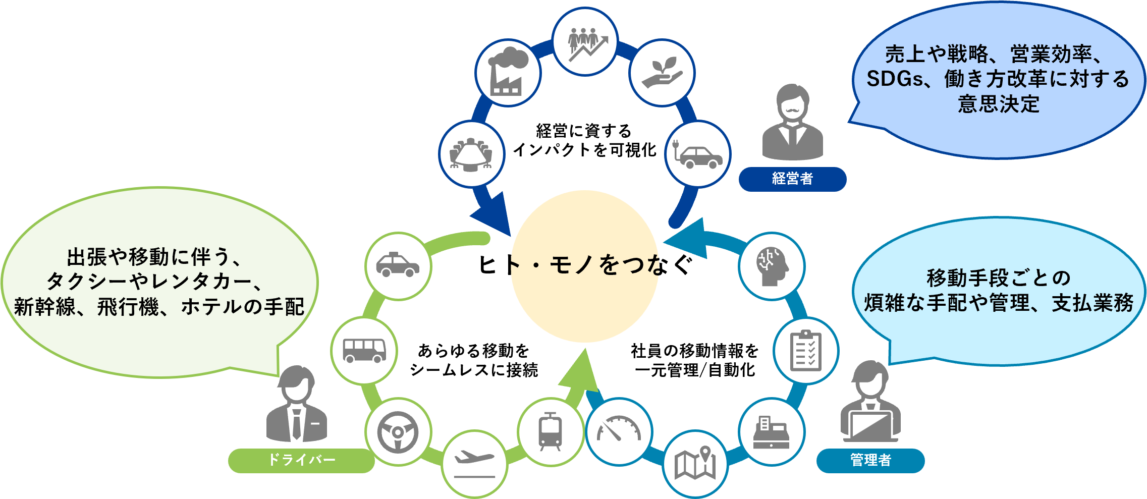 さらに、クルマの利用に関する情報を価値に変え、ドライバーや管理者にとってもっと効率の良い移動や管理方法を実現させるとともに、売上や戦略、働き方改革といった、経営に資するサービス展開も検討しています。
